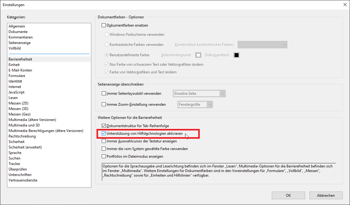 Im Adobe: Menü > Bearbeiten > Einstellungen > Barrierefreiheit
